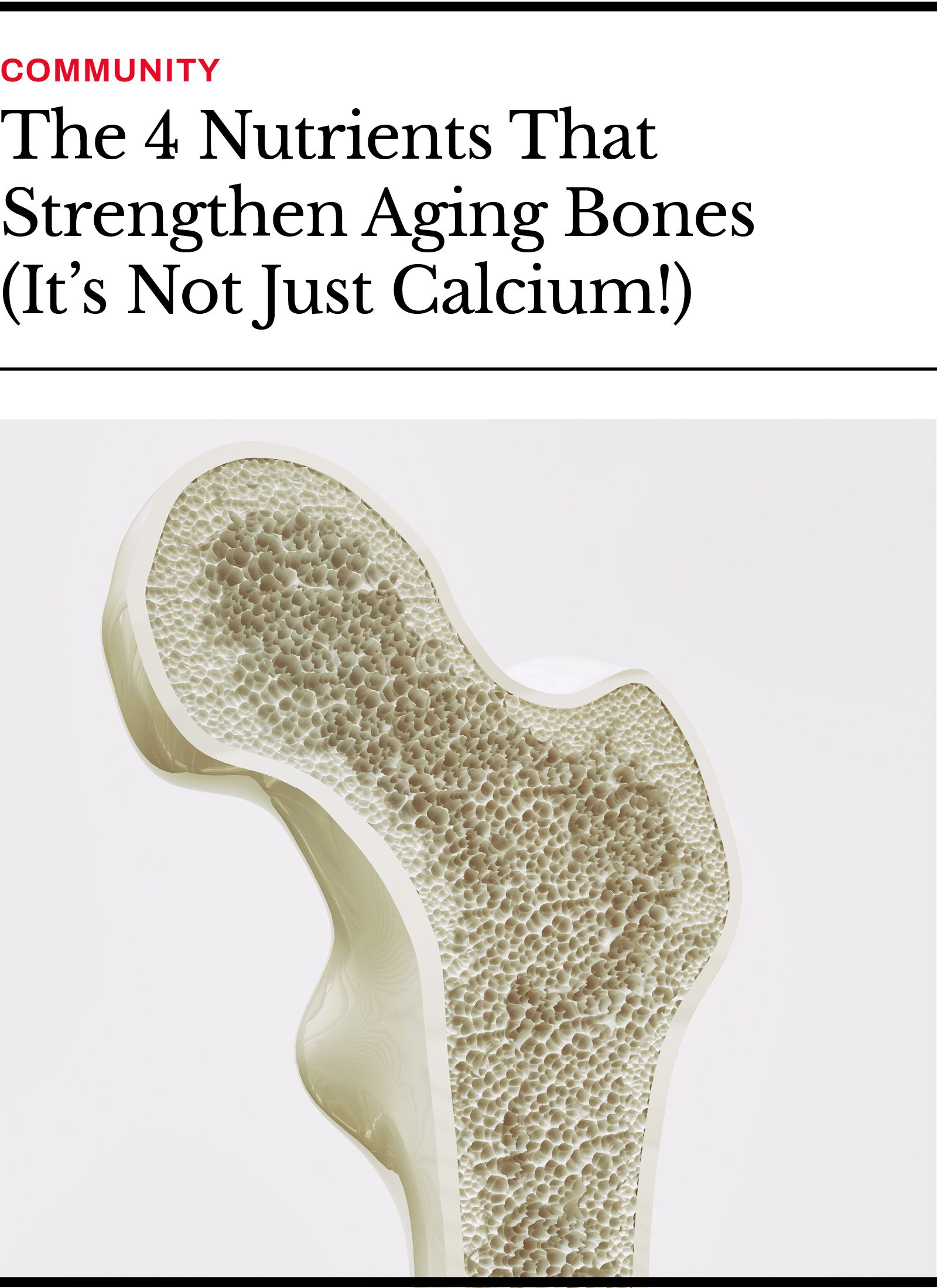 Everyone’s obsessed with protein for building muscle, but it’s just as key for bone health. That’s because collagen (a type of protein) forms the framework that calcium gets deposited into.